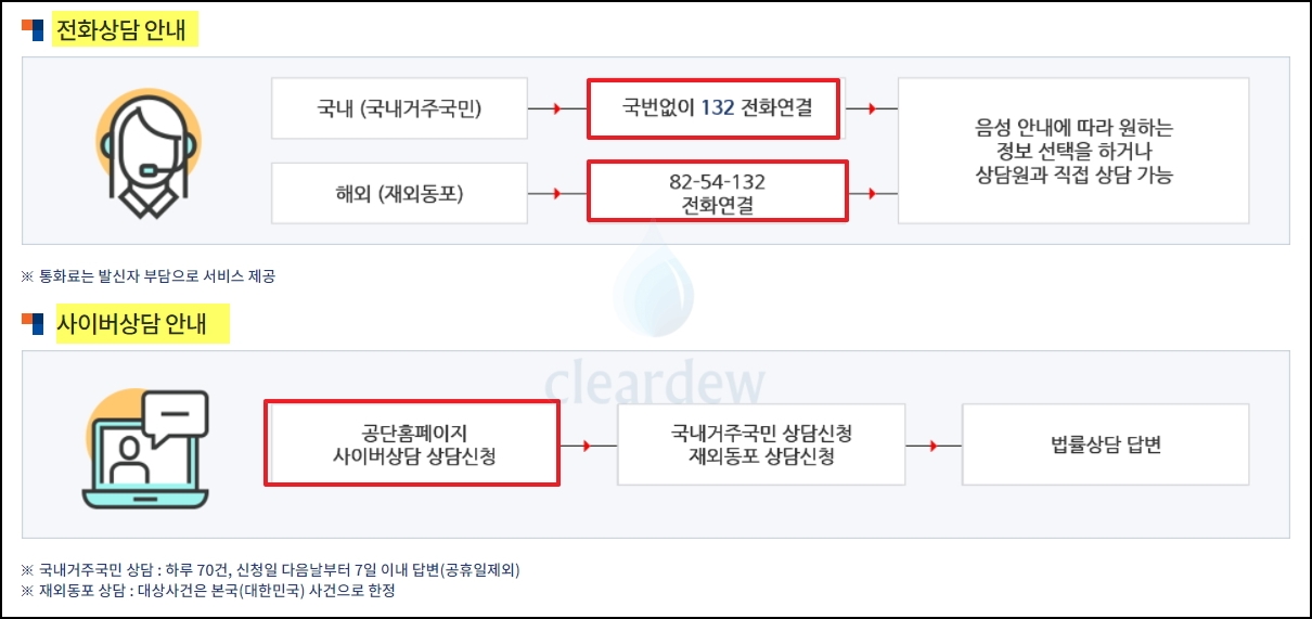 전화를 통해 법률문제의 해결방안을 찾으려고 할 때에는 무료 법률상담을 받아볼 수 있는 콜센터를 이용할 수 있습니다. 해외의 경우에는 전화번호가 조금 다른데요. 국가번호와 함께 위 번호를 입력하면 됩니다. 법률상담이 가능한 시간은 오전 9시부터 11시 50분, 오후 1시부터 5시 50분 사이이오니 참고하시길 바랍니다.