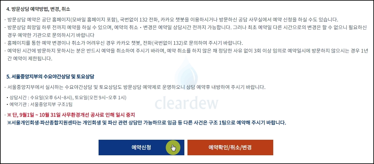 방문상담 페이지 하단을 보면 인터넷으로 방문상담 예약을 신청하는 버튼이 마련되어 있습니다. 취소나 변경도 여기서 이용이 가능합니다.