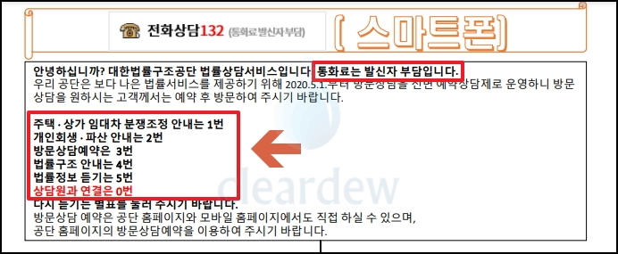 처음 전화를 걸면 안내 멘트가 나타납니다. 여기서 법률상담 카테고리를 선택할 수 있는데요. 1번은 주택 및 상가 임대차 분쟁조정, 2번은 개인회생 및 파산, 3번은 방문상담 예약, 4번은 법률구조 안내, 5번은 법률정보 듣기 입니다. 0번을 누르면 상담원과 연결이 돼요.