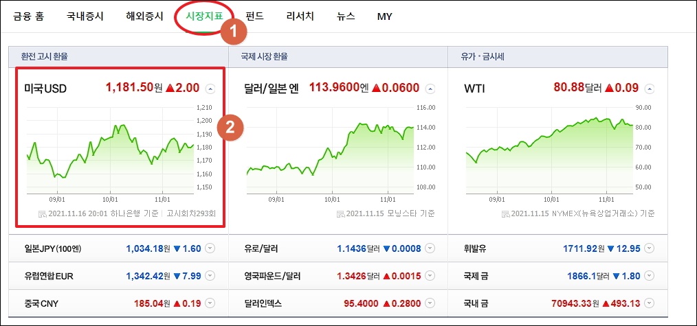요즘 나스닥 지수와 함께 국내 증시에 많은 영향을 주는 요소가 있는데요. 바로 환율이에요. 메뉴에서 "시장지표"를 클릭하면 달러, 엔화, 위완화 등의 통화 관련 정보와 함께 유가나 금시세 확인이 가능해요.