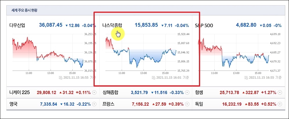 새롭게 열린 페이지를 통해 세계 주요 증시 현황을 편하게 살펴볼 수 있는데요. 가장 먼저 미국의 대표 3대 지수라고 할 수 있는 다우 산업, 나스닥 종합, S&P 500이 보이네요. 보기 좋게 그래프로 되어 있어서 오늘 어떤 흐름을 보였는지 쉽게 파악이 가능해요. 지수 이름을 클릭하면 좀 더 상세한 정보를 확인할 수 있어요.