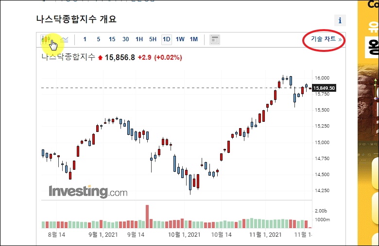 저는 주로 이곳에서 실시간 차트를 보곤 하는데요. 실시간으로 반영이 되기 때문에 그래프가 실시간으로 그려지는 것을 확인할 수 있어요. 차트의 기능이 부족하다고 느껴지면 "기술 차트" 버튼을 클릭해 보세요. 방대한 양의 기능을 만나볼 수 있을 거에요.