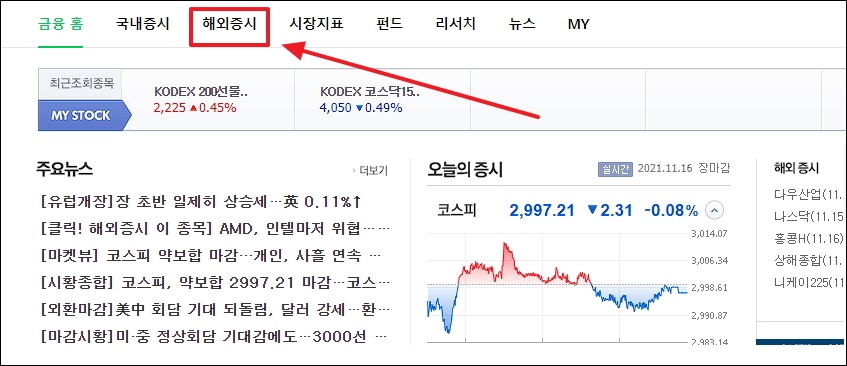 사이트 메인화면을 보면 오늘의 주식 시장에 대한 정보를 한 눈에 볼 수 있도록 되어 있어요. 오늘의 증시를 보면 국내 지수인 코스피와 코스닥에 대한 시세 정보를 실시간으로 확인이 가능해요. 나스닥의 경우 메뉴에서 "해외증시"를 클릭하면 나와요.