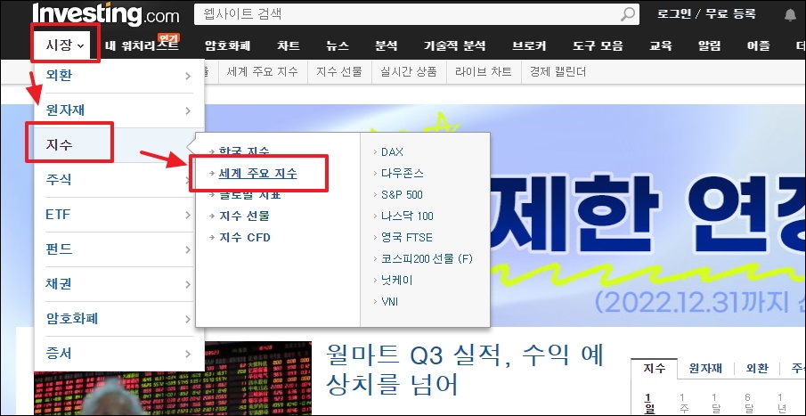 메뉴에서 [시장]을 클릭해 보세요. 그럼 외환, 원자재, 주식, ETF, 암호화폐, 채권 등 여러 상품 목록이 나타나는데요. 여기에서 [세계 주요 지수]를 클릭해 주세요.