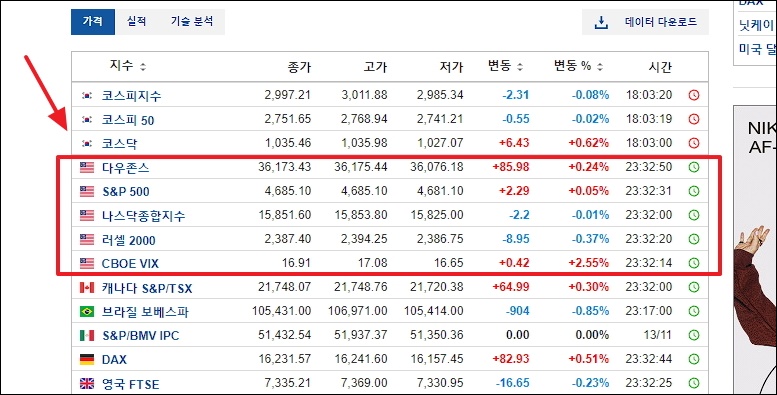 새롭게 열린 페이지를 보면 우리나라 코스피와 코스닥 지수가 보일 텐데요. 그 아래 미국의 다우존스, S&P 500, 나스닥 종합지수, 러셀 200, CBOE VIX가 있어요. 이름을 클릭해 보세요.