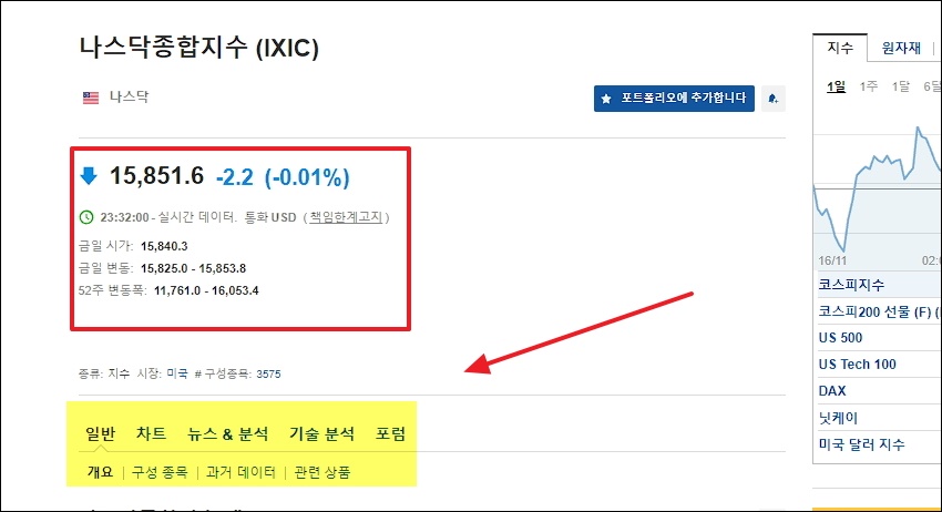 미국 나스닥 지수를 클릭하면 새로운 페이지가 열리는데요. 여기에서 실시간으로 변하는 시세 데이터와 함께, 차트, 뉴스, 분석 자료, 과거 데이터 등 여러 가지 정보 서비스 이용이 가능해요.