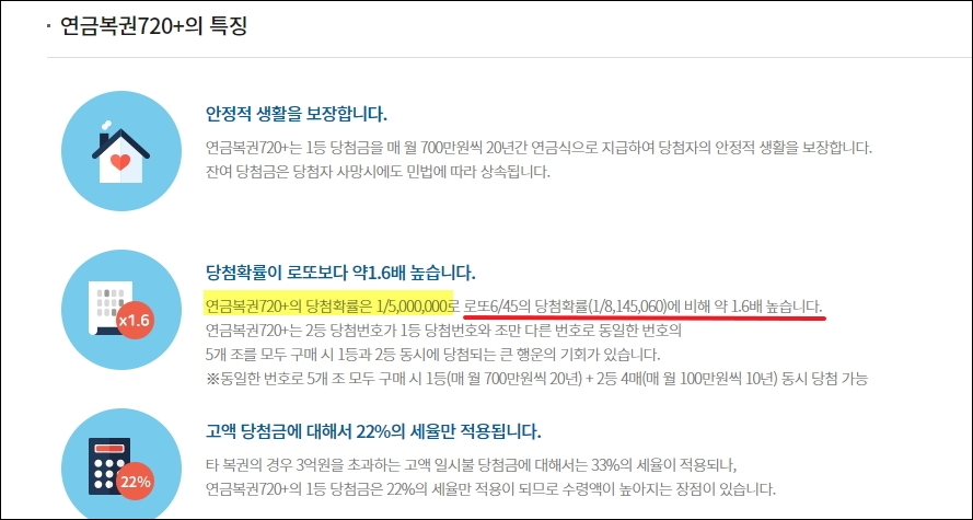 연급복권의 장점이 또 한가지 있는데요. 바로 당첨금에 대한 세율입니다. 연금복권의 경우에는 1등 당첨금의 22%ㅁ의 세율만 적용이 된다고 하네요. 그만큼 수령하는 금액이 높아지겠죠.