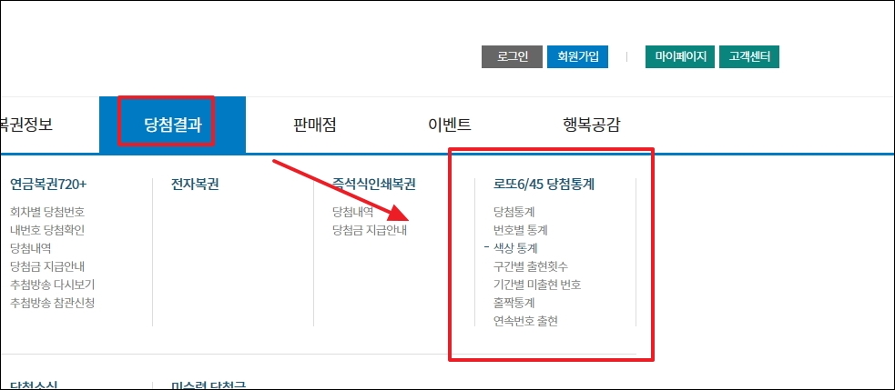 이번에는 통계 자료 이용하는 방법을 알려드리겠습니다. 메뉴에서 [당첨결과]를 클릭한 후 맨 우측 상단에 있는 [로또6/45 당첨통계]를 클릭합니다.
