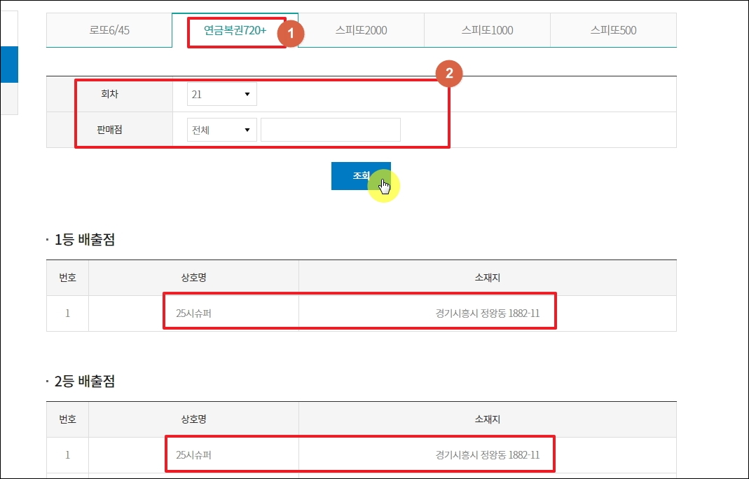 이곳에서는 연금복권 외에도 로또, 스피또에 대한 1등 및 2등 배출점에 대한 정보를 얻을 수 있습니다. 상호명과 소재지을 명확하게 알려주기 때문에 찾아가고자 한다면 참고하기에 정말 좋습니다.