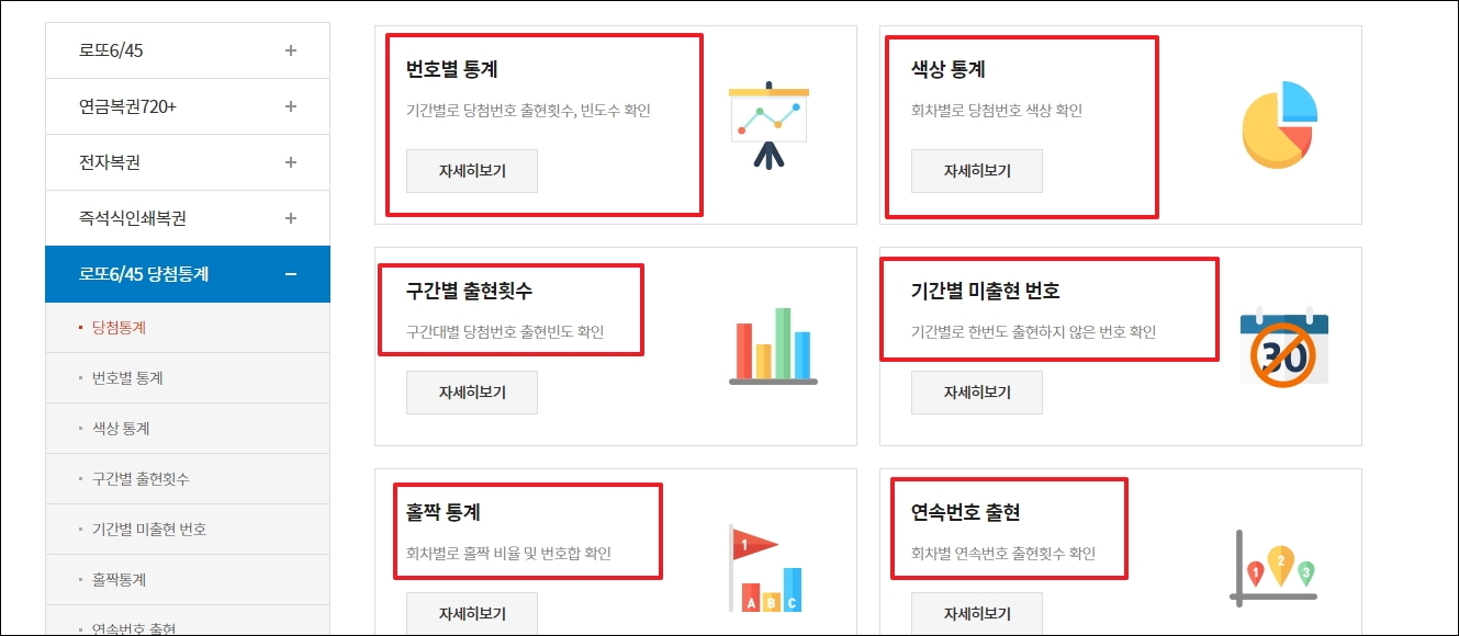 이곳에서 보면 번호별 통계, 색상 통계, 구간별 출현횟수, 기간별 미출현 번호, 홀짝 통계, 연속번호 출현 이렇게 6가지 통계자료를 이용해 볼 수 있습니다. 이러한 정보를 참고한다면 연금복권에 당첨될 확률을 제법 높일 수 있다고 생각합니다. 화면에는 로또 복권 중심으로 나와 있는데요. 좌측에 있는 메뉴에서 [연금복권720+]를 선택하면 확인이 가능합니다.