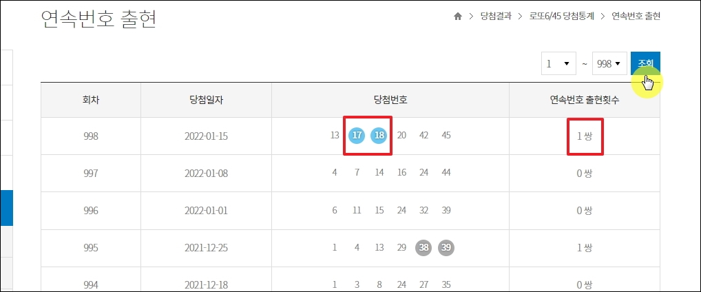 이런 식으로 전 회차의 당첨 결과를 토대로 연속번호 출현횟수 확인이 가능합니다.