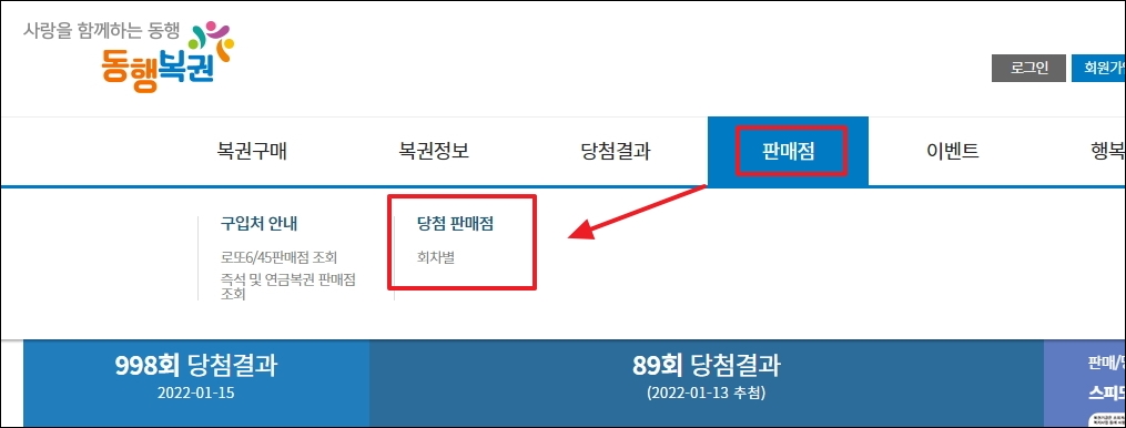 메뉴에서 [판매점]을 클릭하면 연금복권 1등과 2등을 배출한 판매점을 찾을 수 있습니다. 최근 뿐만 아니라 이전에 당첨이 된 곳에 대한 정보도 포함하고 있지요.