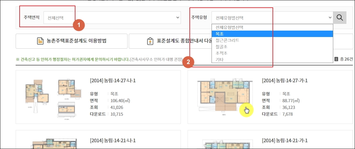 그럼 먼저 전원주택의 면적과 유형을 지정합니다. 그럼 해당 조건에 맞는 자료가 홈페이지 하단에 나타납니다. 간단하게 볼 수 있는 평면도 확인도 가능합니다. 조회수와 다운로드 수를 통해 어떤 자료가 인기가 많은지 또한 알 수 있습니다.
