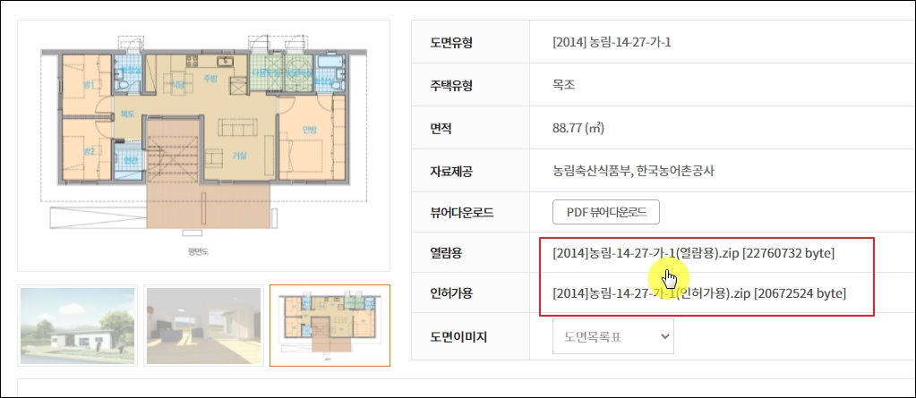 저는 목조로 되어 있고, 면적이 88.77 제곱미터로 되어 있는 전원주택을 찾았습니다. 열람용과 인허가용으로 전원주택 평면도 자료가 구분되어 있다고 말씀 드렸는데요.