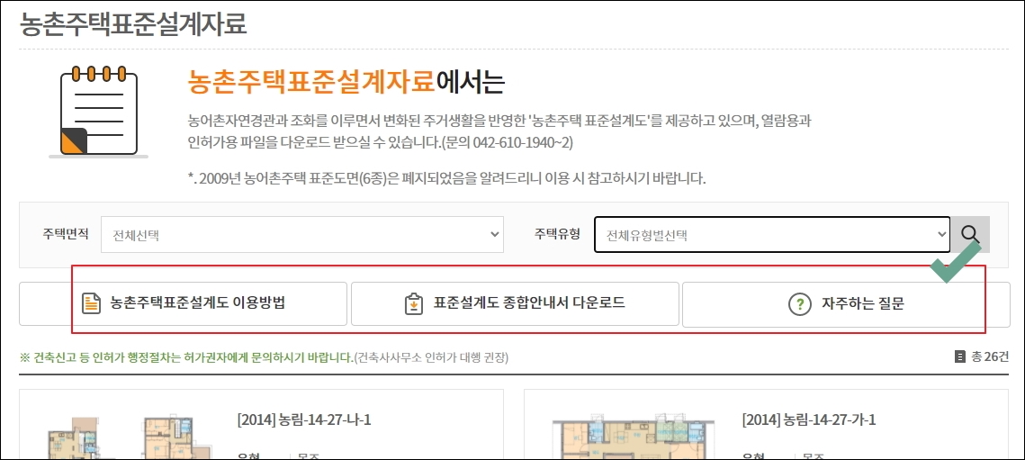 새롭게 열린 페이지를 보면 농촌주택표준설계자료에 대한 이용방법, 종합안내서, 자주하는 질문 이렇게 3가지를 알아볼 수 있습니다. 해당 설계자료는 농어촌자연경관과 조화를 이루면서 변화된 주것생활을 밚영한 것이라고 합니다. 열람용과 인허가용 이렇게 2가지로 전원주택 설계자료가 구분되어 있습니다.