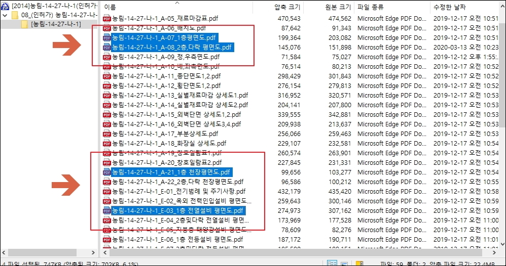 이번 시간에 우리가 얻을 자료는 위와 같이 PDF 파일로 되어 있습니다. 단순히 하나의 평면도만 있는 것이 아닙니다. 재료마감도, 배치도, 평면도, 우측면도, 종단면도, 화장실 상세도 등 꽤 많은 자료를 담고 있습니다. 파일 크기를 보면 아시겠지만, 파일 용량 만큼 높은 퀄리티로 되어 있습니다.