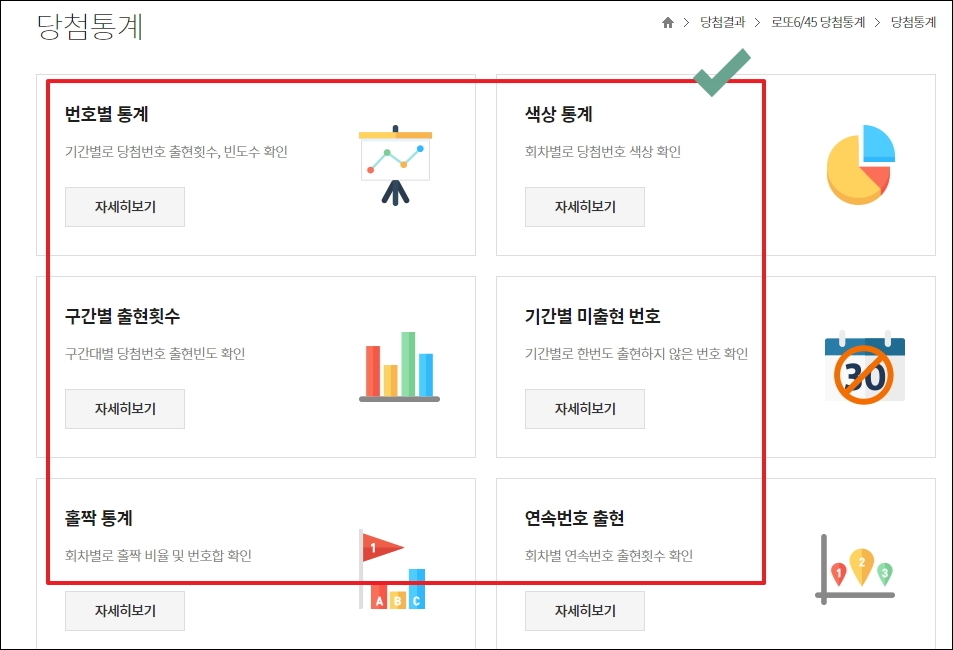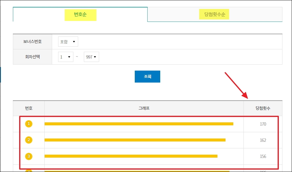 이곳에서는 당첨번호를 선택할 때 참고하기 좋은 통계자료 6가지를 제공하고 있습니다. 기간별로 당첨번호 출현횟수와 빈도수를 확인할 수 있고, 회차별 연속번호 출현횟수를 확인 가능하기도 합니다.
