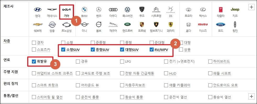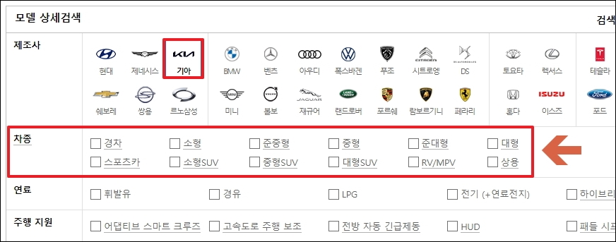 새롭게 열린 페이지를 보면 여러 가지 선택을 할 수 있게 되어 있습니다. 이번 시간에는 SUV 기준으로 기아 자동차 차종별 가격표 확인을 해보도록 하겠습니다. 이외 조건으로는 연료 타입, 주행 지원 장치, 편의 장치, 통풍과 열선이 있사오니 원하는 조건을 체크하시면 됩니다.