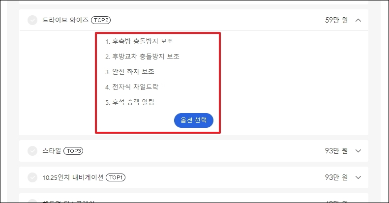 이름만 보고는 해당 옵션이 어떤 것을 의미하는지 모를 수 있습니다. 이럴 때에는 옵션 가격표 우측에 있는 화살표를 클릭합니다. 그럼 옵션에 대한 설명을 확인할 수 있습니다. 기아 자동차의 옵션 중 하나인 드라이브 와이즈는 저도 선택한 것으로써, 안전한 운전에 매우 도움이 됩니다.