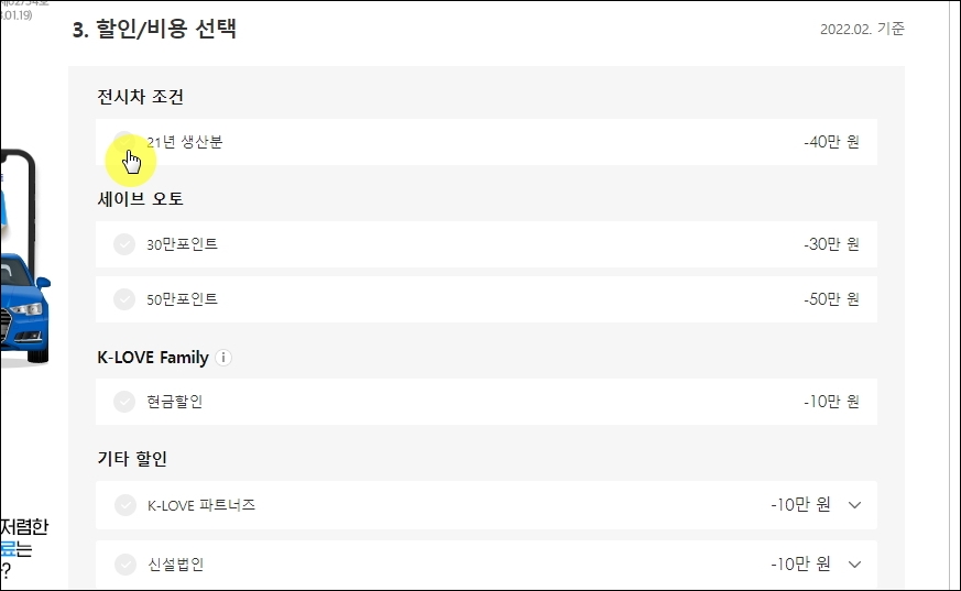 할인 및 비용 선택 부분은 앞서 확인한 판매조건 중에서 본인이 충족할 수 있는 것을 선택하면 됩니다.