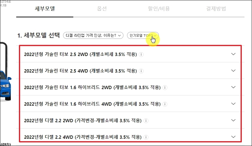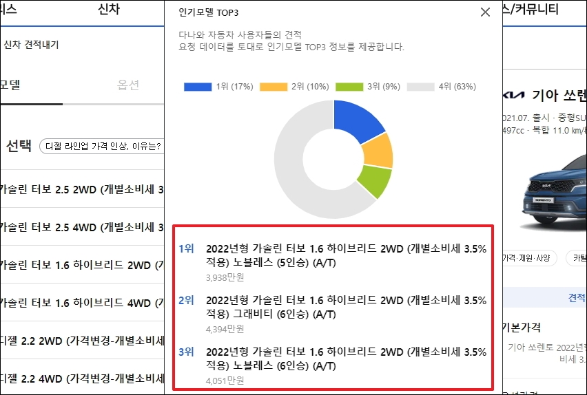 세부모델을 선택하기 어려우면 [인기모델 TOP3]를 클릭합니다. 그럼 해당 기아 자동차 모델에 대한 견적을 알아보고자 한 사람들이 어떤 것을 많이 선택했는지 알 수 있습니다.