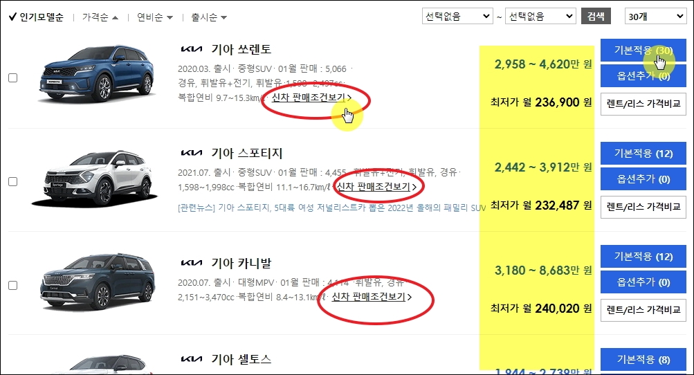 조건을 모두 선택하면 바로 아래에 차종별 가격표가 나타납니다. 가격을 보면 아시겠지만, 범위로 간단하게 나와 있죠. 이것보다 훨씬 구체적이고, 정확도 있는 가격표를 볼 수 있습니다. 차례대로 알려드릴테니 우선 [신차 판매조건보기]를 클릭해 주시길 바랍니다.