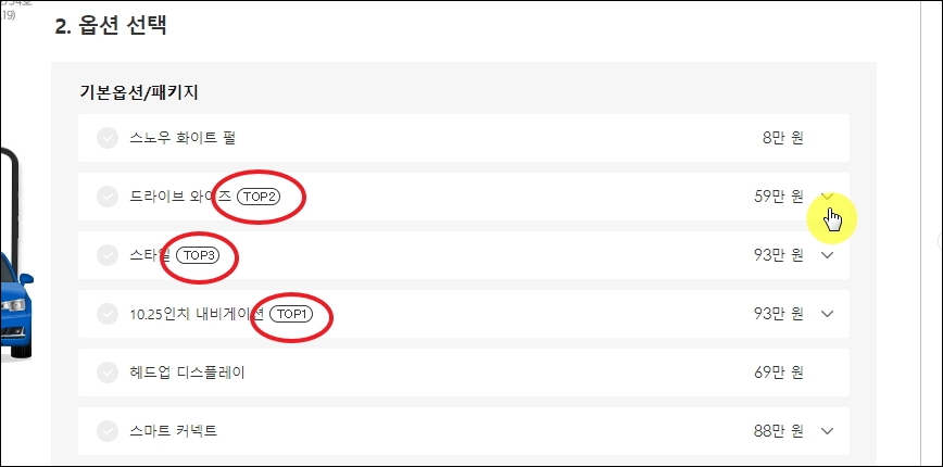 이번에는 옵션을 선택할 차례입니다. TOP 표시가 되어 있는 것들은 사람들이 많이 선호하는 옵션입니다.