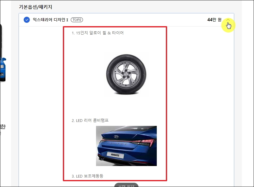 ▼현대자동차에서 정한 옵션명만 보고는 어떤 기능을 하는지 알기 어려울 수 있습니다. 이런 경우에는 가격표 옆에 있는 화살표 아이콘을 클릭해 봅니다. 그럼 해당 옵션에 대한 상세 정보가 나타납니다.