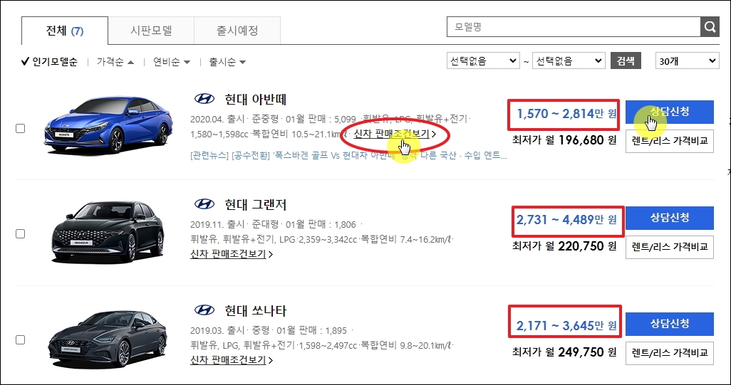 ▼결과가 나왔습니다. 현대자동차의 7개 모델이 검색이 되었습니다. 간단한 가격표가 나오는 것이 확인이 됩니다. 여기에서 [상담신청] 버튼을 누르면 상세한 신차가격표 확인이 가능합니다. 참고로 버튼이 [상담신청]이라고 되어 있을 뿐, 클릭해보면 맞춤신 견적을 바로 확인할 수 있도록 되어 있습니다. 그리고 앞서 언급한 바와 같이 신차 판매조건을 볼 수 있습니다. 차량 정보에 있는 [신차 판매조건보기]를 클릭해 보시길 바랍니다.