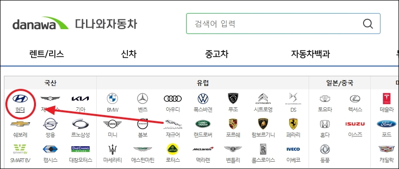 ▼다나와 자동차 홈페이지에 접속했습니다. 메인화면에서 보면 여러 차량 브랜드를 만나볼 수 있습니다. 국산 카테고리에 있는 현대자동차 아이콘을 클릭합니다. 현대자동차 외에 수입차 브랜드인 BMW, 벤츠, 아우디, 폭스바겐, 랜드로버, 포르쉐, 벤틀리, 이베코, 렉서스 등 여러 브랜드의 2022년 신차가격표 확인을 하는 것도 가능합니다.
