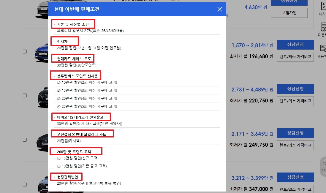 ▼현대자동차의 승용차 모델 중 하나인 아반떼의 2022년 2월 판매조건이 정리된 표가 나타났습니다. 일정 조건을 준수하면 가격표에 명시된 금액에서 추가로 할인을 받을 수 있습니다.