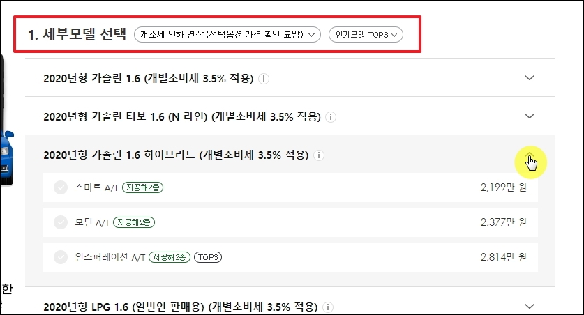 ▼[상담신청] 버튼을 클릭하면 상세한 맞춤식 현대자동차 신차가격표 2022년 자료를 만나볼 수 있습니다. 몇 가지 선택을 해야 합니다. 본인 취향에 맞는 조건을 선택합니다. 가장 먼저 세부모델입니다.