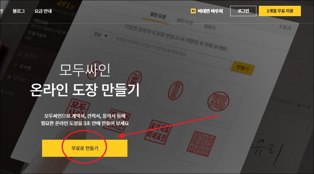 ▼국내 기업 중에 전자계약 서비스를 진행하는 곳이 있습니다. 바로 모두싸인 입니다. 이곳에서는 누구나 무료로 자신의 온라인 도장을 만들 수 있도록 관련 서비스를 제공하고 있습니다. 바로 간편 온라인 도장 만들기 서비스입니다. 도장과 더불어 싸인을 만드는 것도 가능합니다.