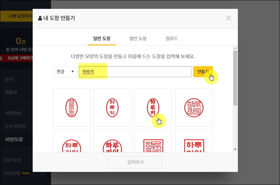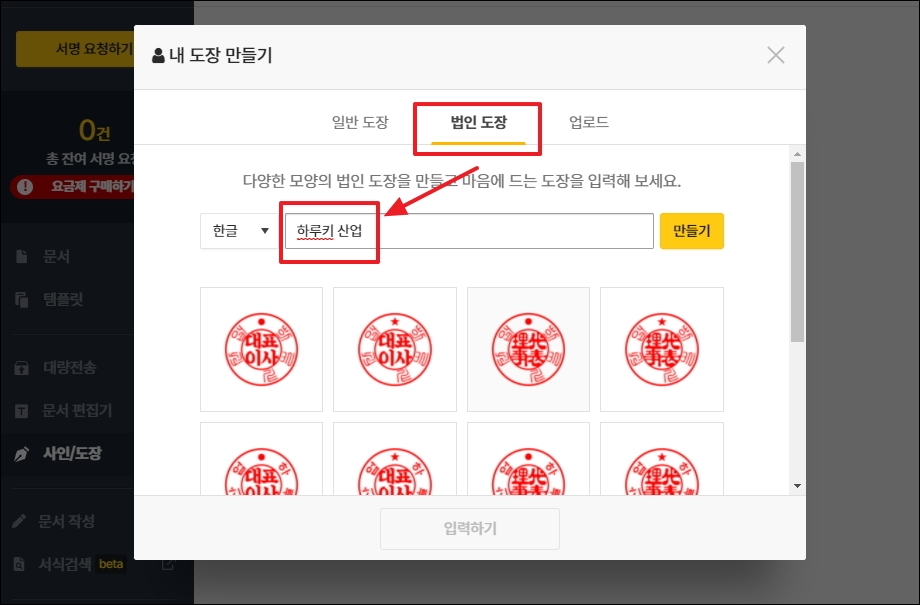 ▼법인 도장 만들기도 가능합니다. 회사 이름을 입력하기만 하면 이에 맞는 도장 이미지를 자동으로 만들어 줍니다.