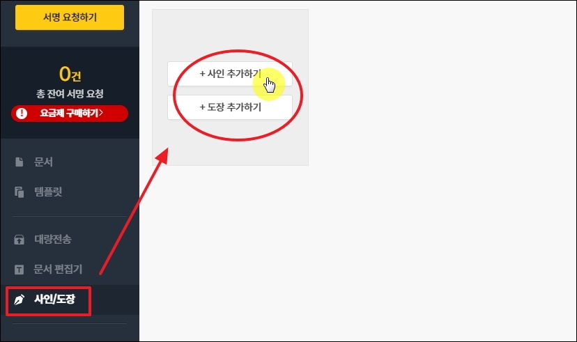 ▼로그인을 하면 이렇게 모두싸인에서 제공하는 마이 페이지가 열립니다. 자신의 전자계약 관련 정보를 관리하고, 대량 전송, 문서 편집기 등을 사용할 수 있는 페이지입니다. 좌측에 보면 여러 메뉴가 보이는데, 여기에서 [사인/도장]을 클릭합니다. 그럼 싸인 만들기 할 수 있는 프로그램을 실행할 수 있는 서비스 버튼이 나타납니다.