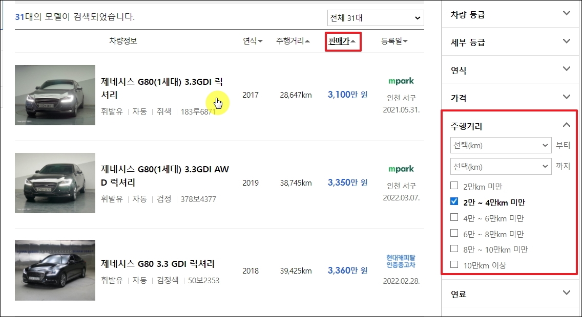 ▼세부 등급, 연식, 가격, 주행거리, 연료 등 여러 가지 상세 조건을 지정할 수 있습니다. 적당한 주행거리인 2만에서 4만 km 사이로 조건을 지정했습니다. 해당 조건에 맞는 중고차시세표가 나왔습니다. 여기에서 표 머리글에 있는 [판매가]를 클릭하면 저렴한 순서대로 제네시스 중고차 매물을 비교할 수 있습니다.