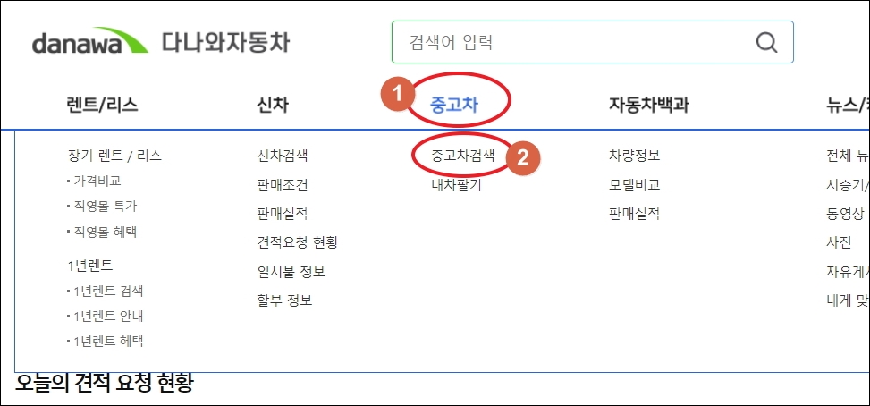 ▼사이트에 접속하면 메뉴에서 [중고차 검색]을 클릭합니다. 사이트 메뉴를 보면 알 수 있듯이 렌트, 리스, 신차, 판매실적 등 다양한 정보를 얻을 수 있습니다. 신차의 경우 견적표를 온라인 상에서 바로 확인이 가능하기 때문에 제네시스 신차 가격표를 알아볼 때 매우 유용합니다.