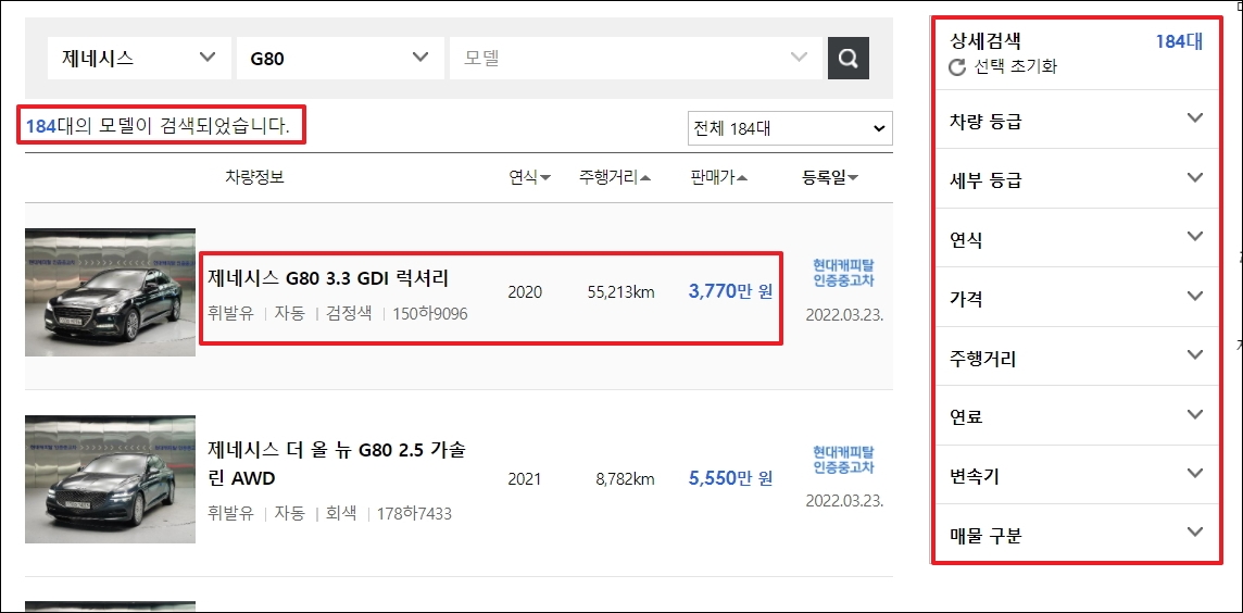 ▼검색 결과 제네시스 중고차시세표가 나타났습니다. 총 184대의 매물이 나왔는데, 리스트 상에서 보면 간단한 차량정보, 연식, 주행거리, 판매가 확인이 가능합니다. 시세표 비교를 할 때 우측에 있는 상세 검색 기능을 사용하면 좋습니다. 같은 조건에서 어떤 것이 저렴한지 찾아내는 데에 도움이 됩니다.