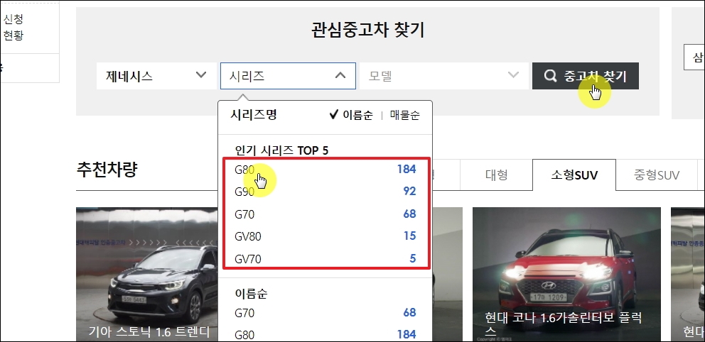 ▼중고차 검색을 할 때에는 [관심 중고차 찾기] 과정을 거쳐야 합니다. 브랜드는 "제네시스"를 선택하면 되고, 시리즈는 G80, G90, G70 등 본인이 원하는 시리즈를 선택하면 됩니다. 아무래도 매물이 많은 것을 선택하는 것이 좋습니다. 그래야 정확하게 중고차시세표 비교 및 확인을 하는 데에 용이하기 때문입니다.