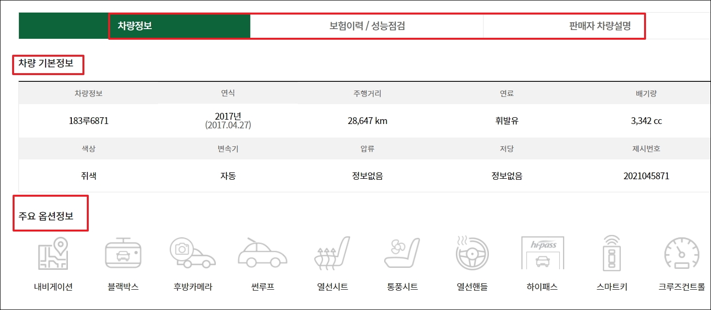 ▼시세표에서 마음에 드는 중고 매물을 찾았다면 마우스로 클릭해 봅니다. 그럼 새로운 페이지가 열리면서 많은 사진과 정보를 볼 수 있습니다. 사진을 통해 외관, 내부를 자세히 살펴볼 수 있습니다.