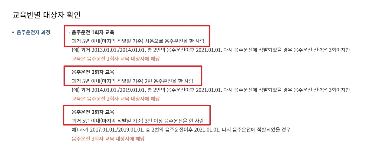 ▼음주운전에 관련된 과정은 3가지로 구분이 됩니다. 기준은 과거 5년 이내 음주운전을 한 횟수가 됩니다. 마지막 적발일 기준입니다.