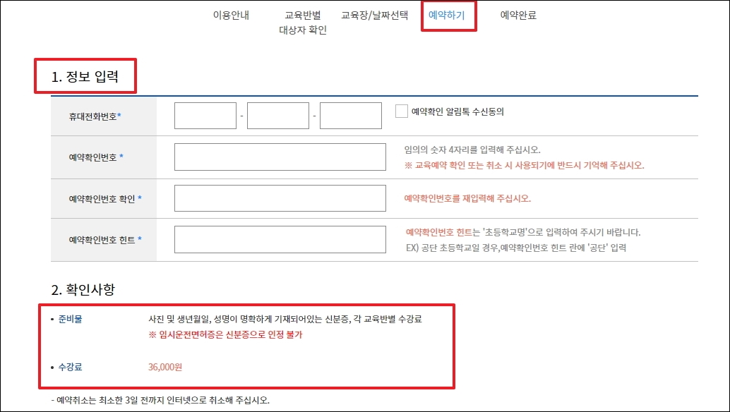 ▼마지막 단계에서는 휴대전화번호, 예약확인번호 등의 정보를 입력해야 합니다. 안내와 같이 예약을 하고 나면 준비물과 수강료를 꼭 확인해 주시길 바랍니다. 추후 변경이 있을 수 있겠지만, 금일 기준으로는 음주운전 1회자의 경우 36,000원, 2회자는 48,000원, 3회자는 96,000원의 수강료로 책정되어 있습니다.