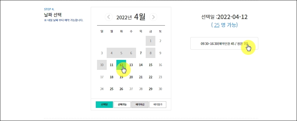 ▼날짜를 선택할 때에는 홈페이지에 나타난 달력에서 찐한 검정색으로 되어 있는 날짜만 선택이 가능합니다. 날짜를 선택해보면 바로 우측에 시간 선택도 가능합니다. 예약 마감이 빠르게 되는 경향이 있기 때문에 미리 신청하는 것이 좋습니다.