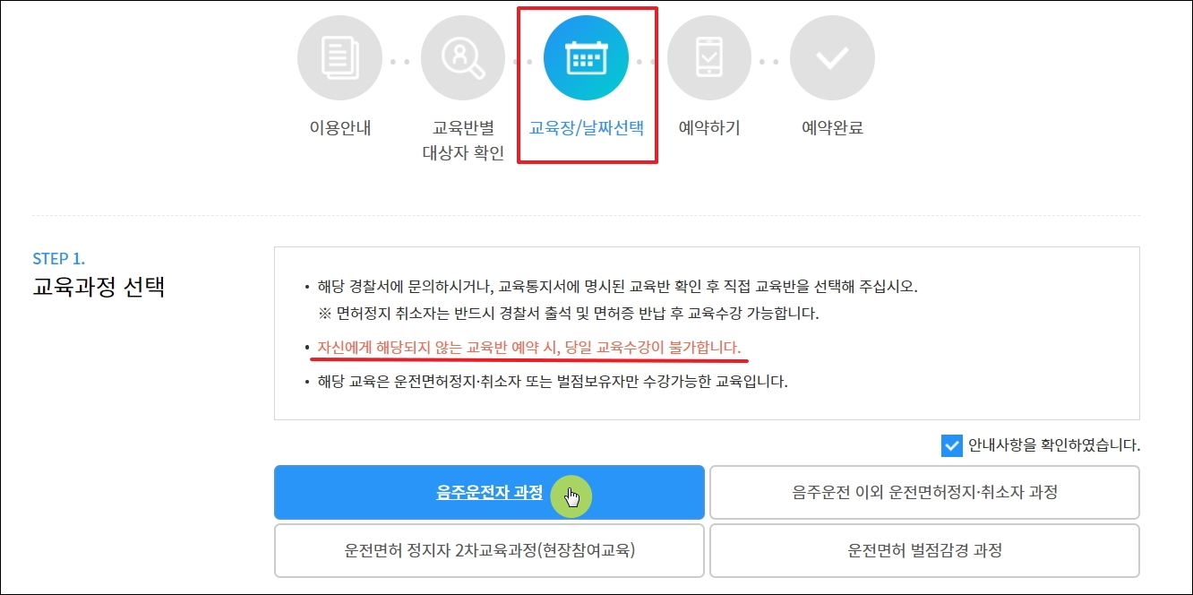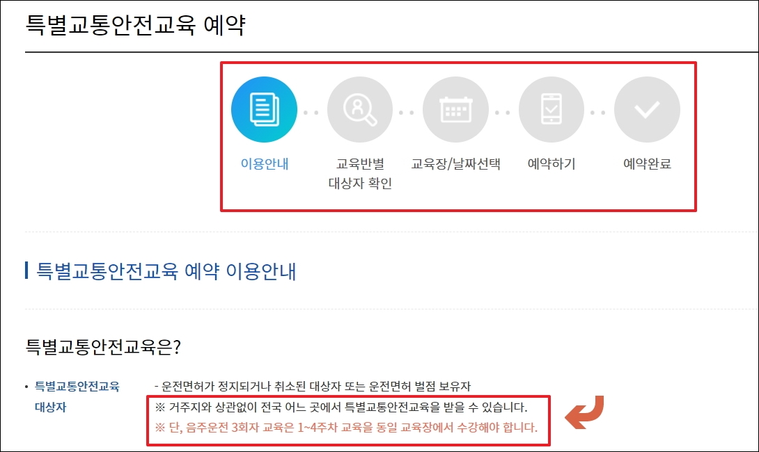 ▼신청 과정은 5단계로 진행이 됩니다. 안내문을 읽어보고, 대상자 확인을 합니다. 그 다음 교육장을 찾아서 예약을 진행하면 됩니다. 안내에 나와 있듯이 음주운전 3회자의 경우 1에서 4주차 교육을 동일한 곳에서 수강해야 하오니 이 점 참고해 주시길 바랍니다.