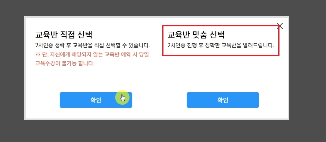 ▼안전운전 통합민원 사이트에서 2차인증을 한 경우에는 맞춤으로 어느 교육반이 좋을지 알려줍니다. 직접 선택을 하고 싶은 경우에는 좌측에 있는 메뉴를 선택하면 됩니다.