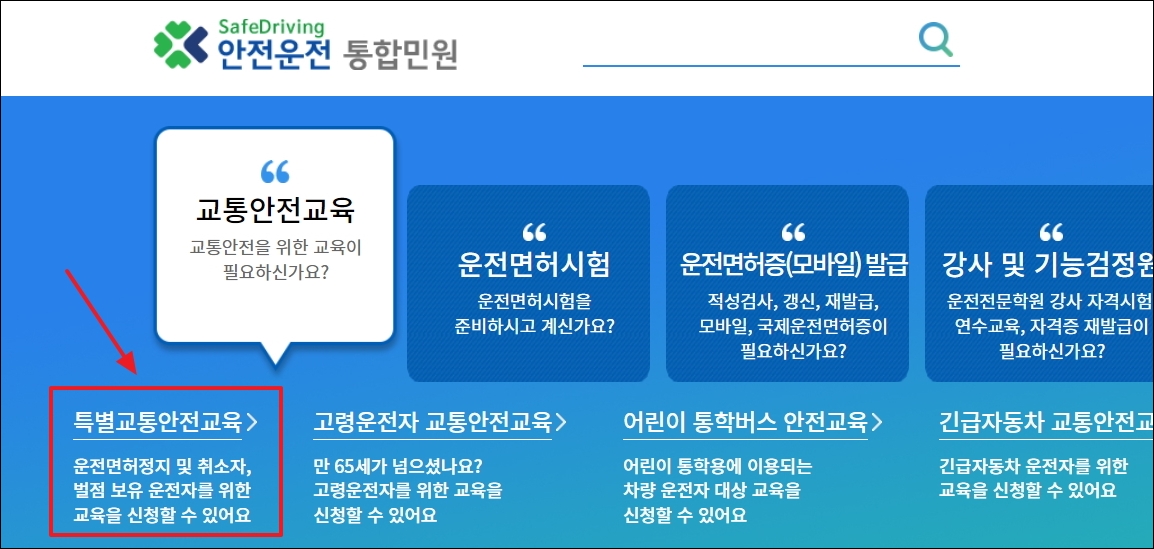 ▼안전운전 통합민원 사이트에 접속했습니다. 운전면허에 관련된 대부분의 서비스를 제공하고 있는 곳입니다. 그만큼 메뉴가 많아서 이용하고자 하는 서비스가 어떤 것인지 찾는 데에 시간이 걸릴 수 있습니다. 음주운전의 경우에는 메뉴에서 가장 첫 번째에 있는 [교통안전교육] 메뉴를 클릭하면 나타납니다. 여러 가지 교육을 신청할 수 있는 하위 메뉴가 나타나는데, 여기에서 [특별교통안전교육]을 선택하면 됩니다.