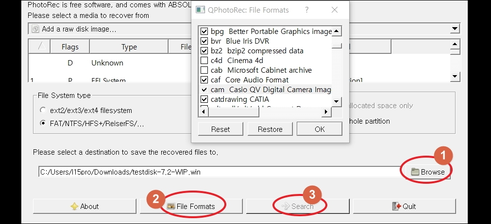 ▼외장하드에서 복구한 데이터를 저장할 폴더를 지정할 차례입니다. 1번에 있는 Browse 버튼을 클릭한 후 내 컴퓨터에서 데이터를 저장하고 싶은 폴더를 지정하면 됩니다. 데이터를 복구해보면 아시겠지만, 복구가 되는 파일의 수가 꽤 많습니다. 그렇기 때문에 2번 버튼인 File Formats 버튼을 클릭하여 확장자를 지정해 줍니다. 마지막으로 Search 버튼을 누르면 외장하드에서 삭제한 데이터를 복구하는 작업이 진행됩니다.