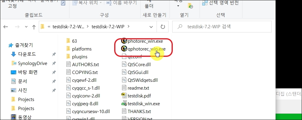 ▼다운 받은 파일은 압축이 되어 있습니다. 반디집이나 알집과 같은 프로그램을 이용하여 압축을 풉니다. 여러 개의 파일이 나타나는데, 여기에서 qphotorec 파일을 실행해 줍니다.