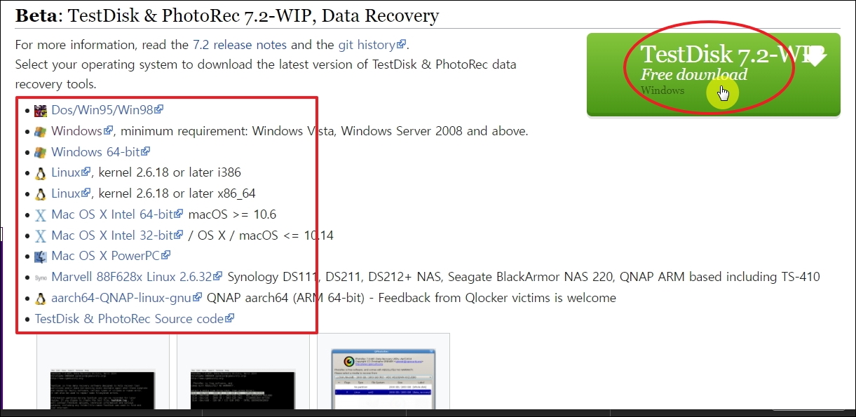 ▼CGSeucrity 사이트에 접속하면 좌측에 여러 메뉴가 보이실 겁니다. 여기에서 Download 메뉴를 클릭합니다. 그럼 프로그램을 다운 받을 수 있습니다. 해당 프로그램의 경우 도스, 리눅스, 맥북, 윈도우 등 다양한 운영체제에서 사용할 수 있습니다. 최근에 출시한 것은 베타버전이고, 이것보다 오래 전에 출시된 것을 정식버전이 있습니다. 어떤 것을 사용해도 외장하드 데이터 복구를 하는 데에 별 차이 없습니다. 개인적으로 최신 버전을 주로 사용합니다.
