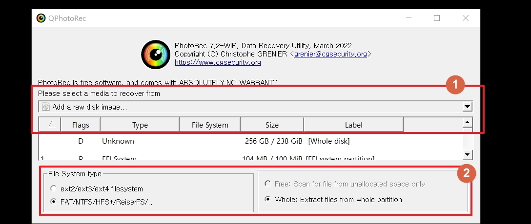 ▼qphotorec 프로그램을 이용하여 데이터 복구를 하는 방법을 자세히 알려드리겠습니다. 하나씩 따라 해보면 알 수 있겠지만, 굉장히 간단하고, 쉽습니다. 가장 먼저 하드디스크를 선택합니다. 1번 박스를 클릭한 후 외장하드 위치를 선택해 주면 됩니다. 2번에 있는 파일 시스템 타입의 경우 외장하드 정보를 참고하여 선택해 줍니다. 잘 모르는 경우에는 기본 설정으로 냅두어도 괜찮습니다.